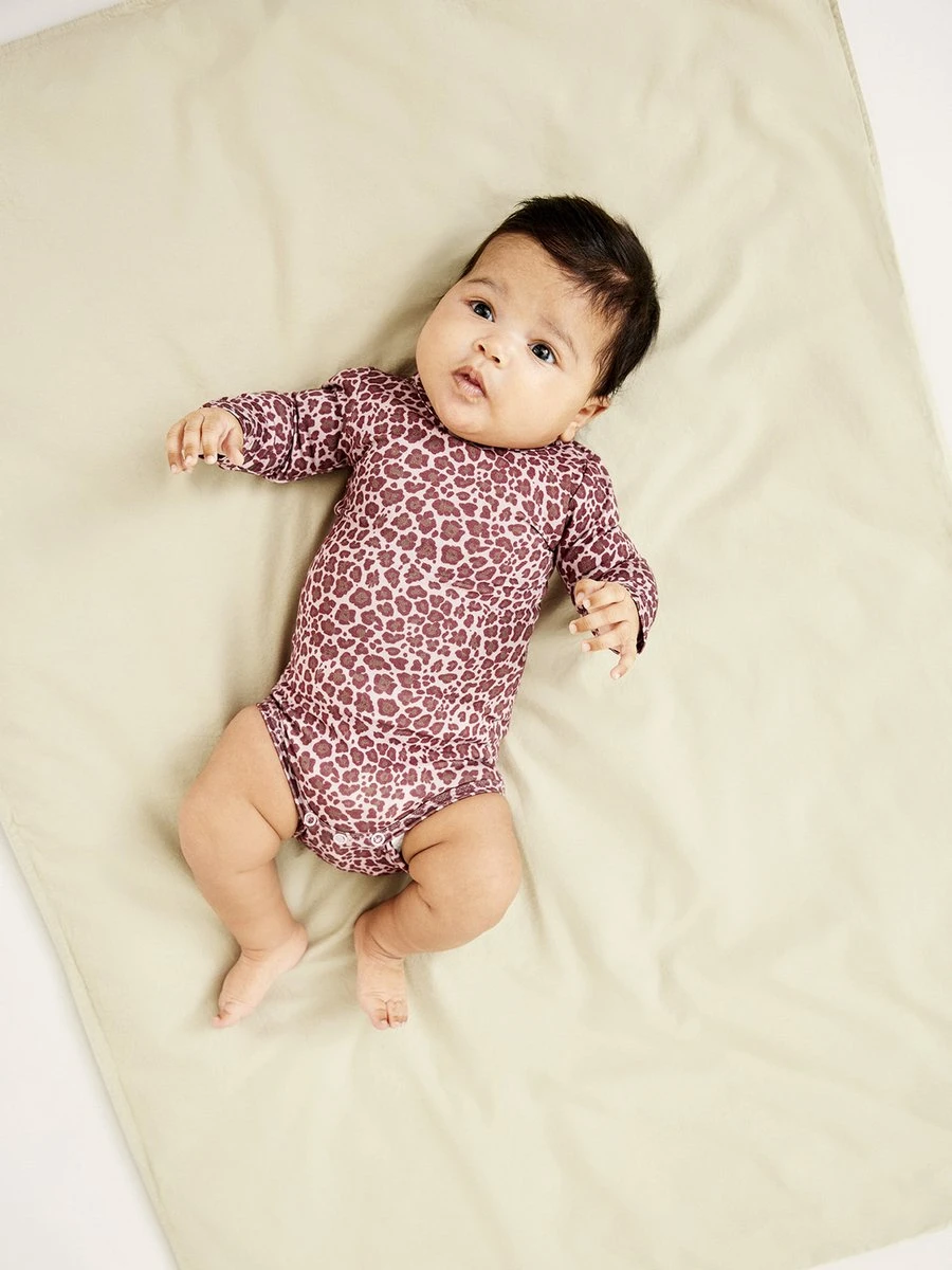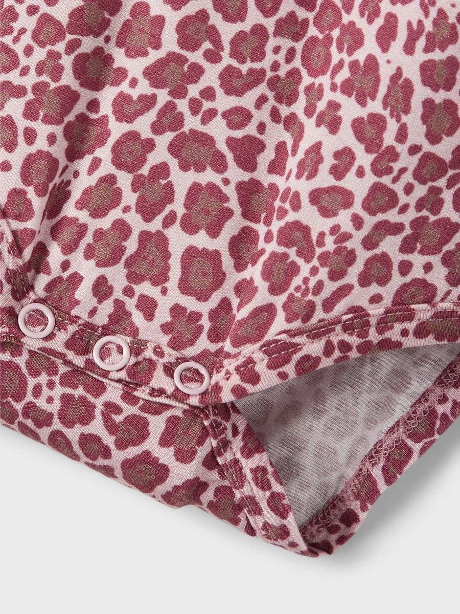 Een rompertje voor baby meisjes van het merk Name It, gemaakt van viscose LENZING™ ECOVERO™. Het aansluitende rompertje heeft een ronde hals, lange mouwen en een drukknoop sluiting aan de onderzijde. Ook is het rompertje voorzien van een all over drierenprint.