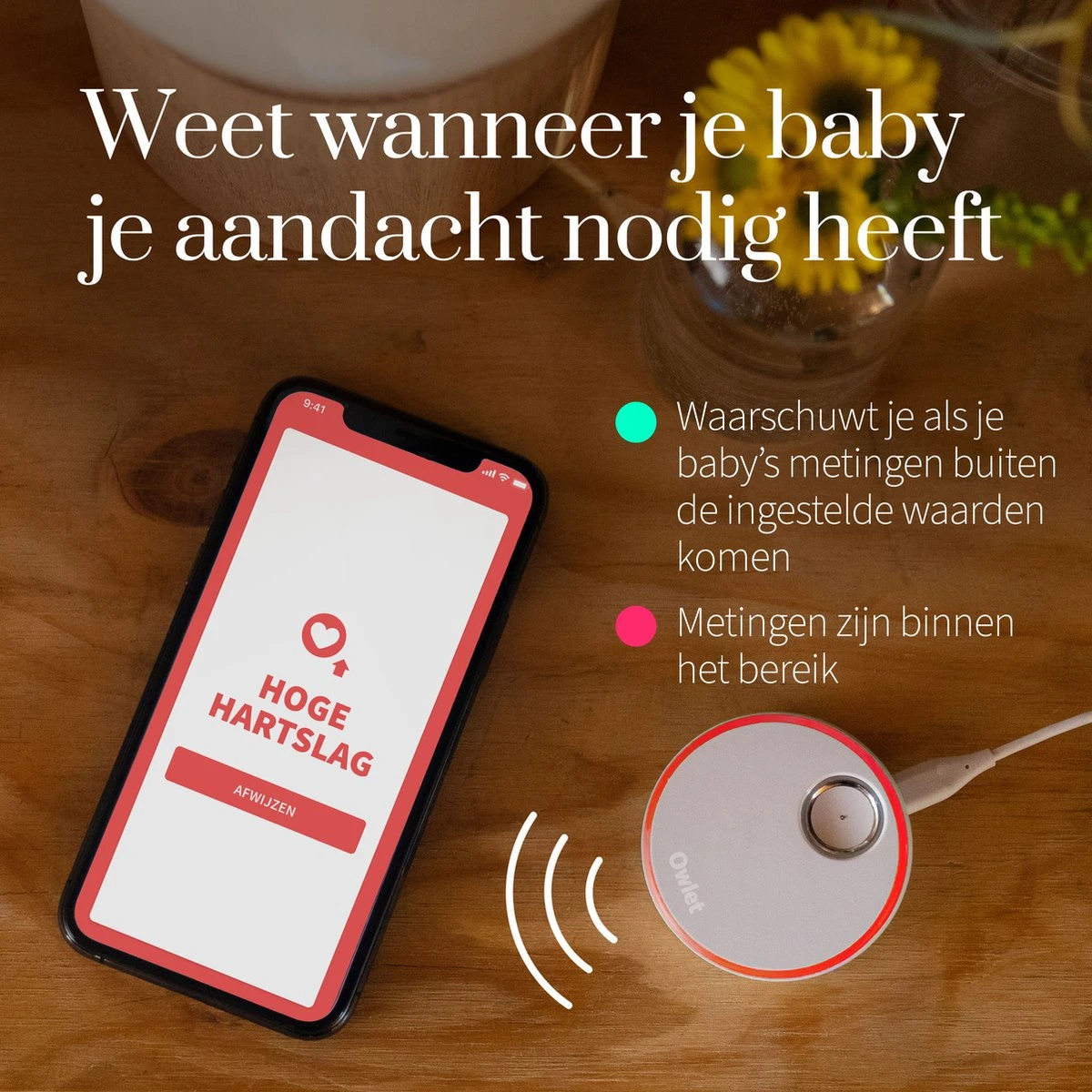 - Vertelt je wanneer je baby je nodig heeft: Basisstation en Owlet-app geven meldingen wanneer meetwaarden buiten de ‘veilige’ zones komen.