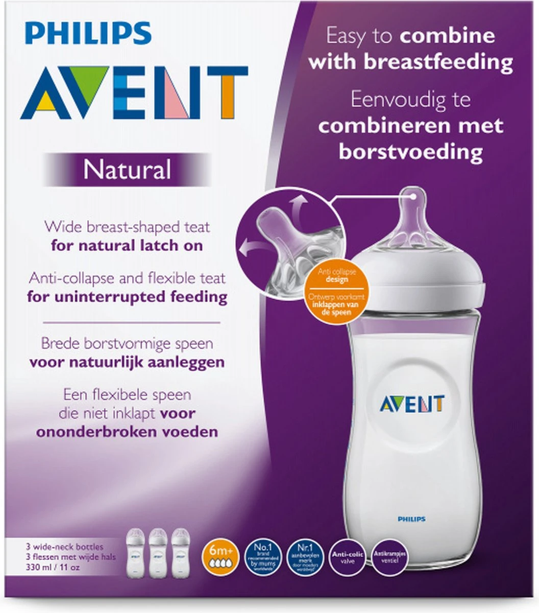De Philips Avent Natural voedingsfles SCF036/37 is de meest natuurlijke manier om flesvoeding te geven. Door de brede vorm van de speen, die lijkt op de vorm van een borst, wordt natuurlijk aanleggen gestimuleerd. Dit maakt deze voedingsfles ook makkelijk te combineren met borstvoeding. Zo geniet je baby van alle voordelen van moedermelk, ook al ben je er niet. De voedingsspeen is voorzien van een flexibel en spiraalvormig design met unieke comfortkussentjes die zorgen voor een natuurlijke manier van voeden, zonder dat de voedingsspeen inklapt. Tevens is de voedingsfles zo ontworpen dat de lucht uit de maag van je baby wordt gehouden wat darmkrampjes en andere ongemakken tijdens het voeden helpt verminderen.