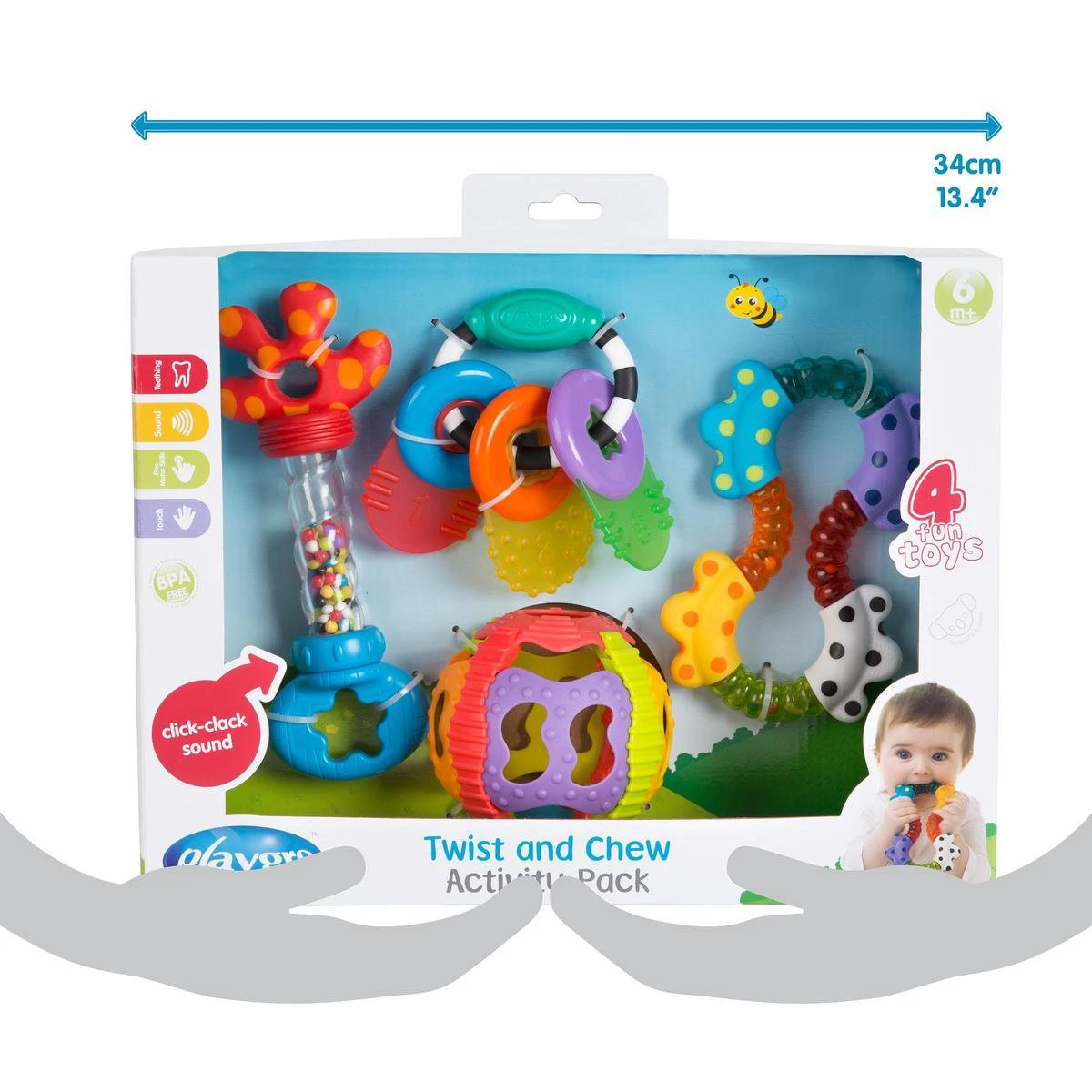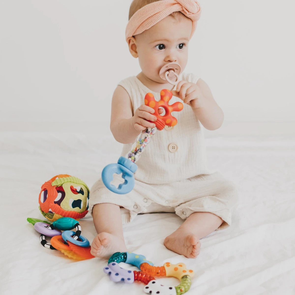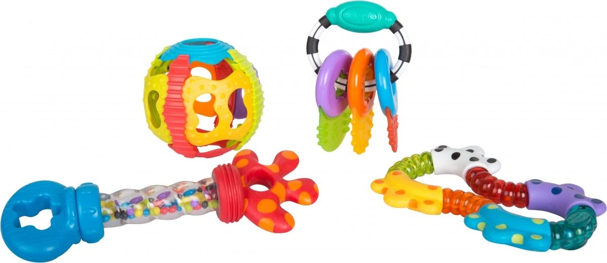 * 4 ontwikkel speeltjes * Geribbelde bijtringen om de pijn te verlichten bij doorkomende tandjes
