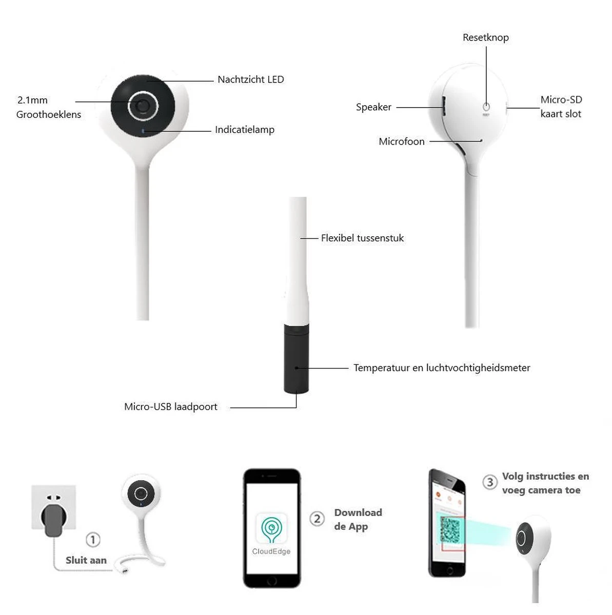 Wilt u de beelden opnemen of de babyfoon ook gebruiken als bewakingscamera ? op een micro-SD-kaart van 16 GB kunt u 72 uur continue video-opnamen bewaren. Indien gewest kunt u ook de beelden opslaan in de Cloud. Let op! hier zijn extra kosten aan verbonden. De opnameduur kunt u naar keuze instellen op 1, 3 tot 5 minuten na de detectie. .