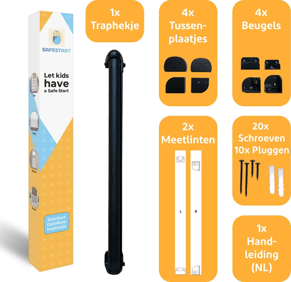 Met het SafeStart oprolbare traphekje is jouw kindje volledig veiliggesteld voor de gevaren in huis. Monteer hem snel én eenvoudig op de gewenste plek en voorkom dat je kindje in onveilige situaties terecht komt.