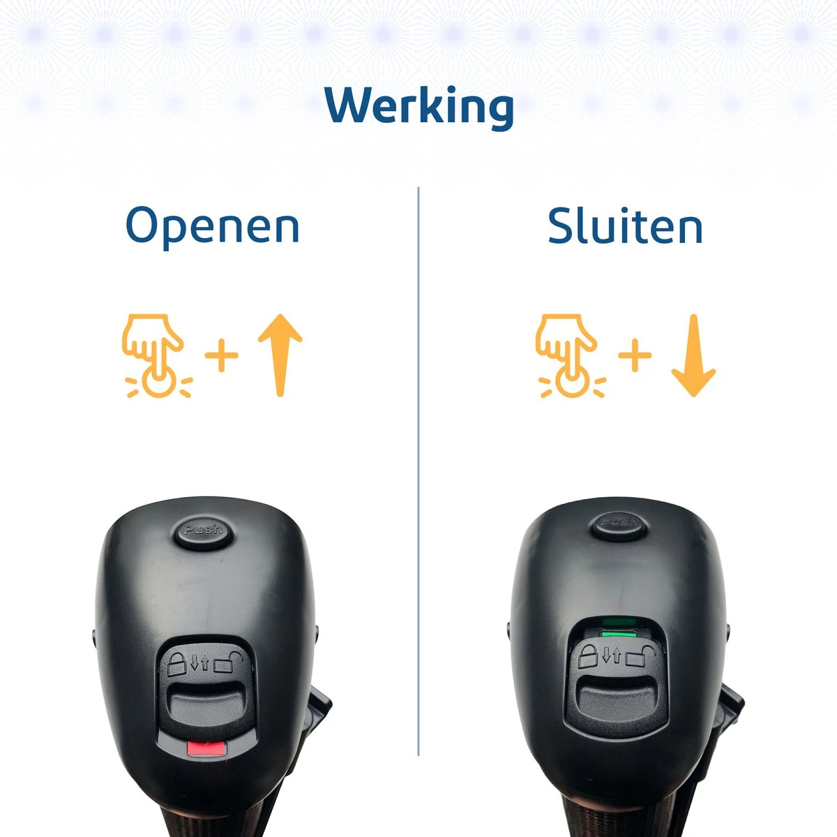 Het traphekje van SafeStart is uitgerust met de innovatiefste sluiting van dit moment. Met één druk op de knop haal je hem van zijn slot af en rolt hij zichzelf automatisch op. Andersom gaat dit net zo gemakkelijk: trek aan de rol en druk hem in het slot. Zo gepiept!