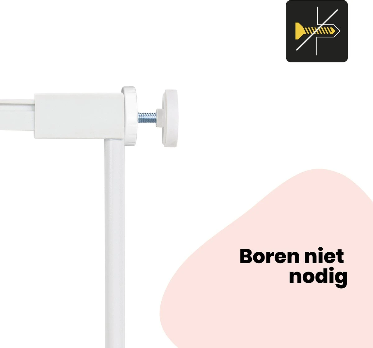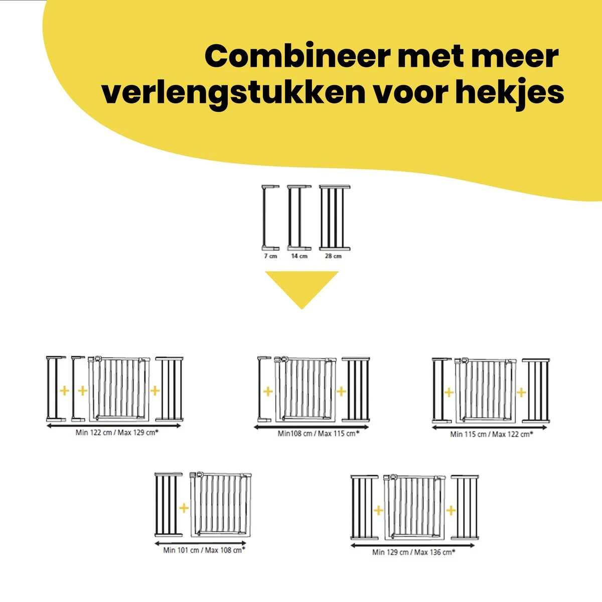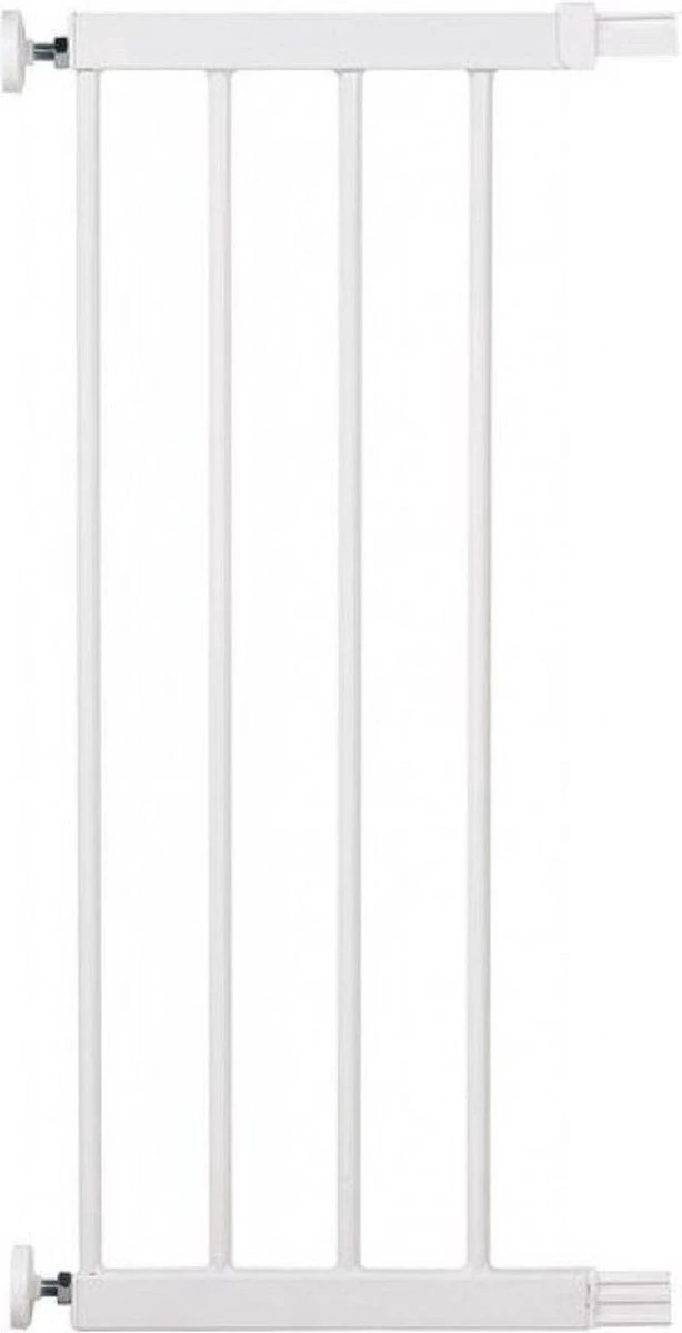 Het witte verlengstuk28 cm voor het veiligheidsrekje Easy Close Gate van Safety 1st is ideaal voor brede openingen die je wilt blokkeren voor nieuwsgierige en ondernemende kleintjes. Voor je het weet kruipt je kindje richting de trap of wandelt hij een onveilige ruimte in. Gebruik het Safety 1st verlengstuk van 28 cm om het veiligheidsrekje passend te maken tussen muren of deurposten. Het Safety 1st verlengstuk met traphekje klem je, zonder schroeven, op vier punten tussen de gewenste oppervlakken en is verstelbaar van 80 tot 108 cm