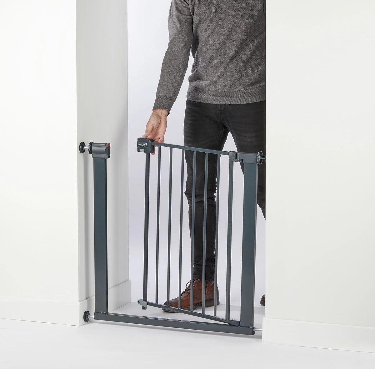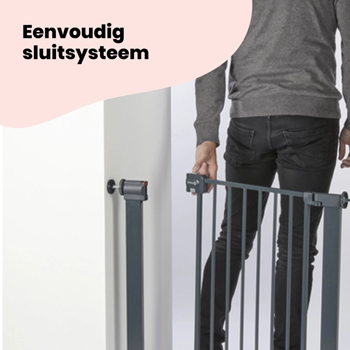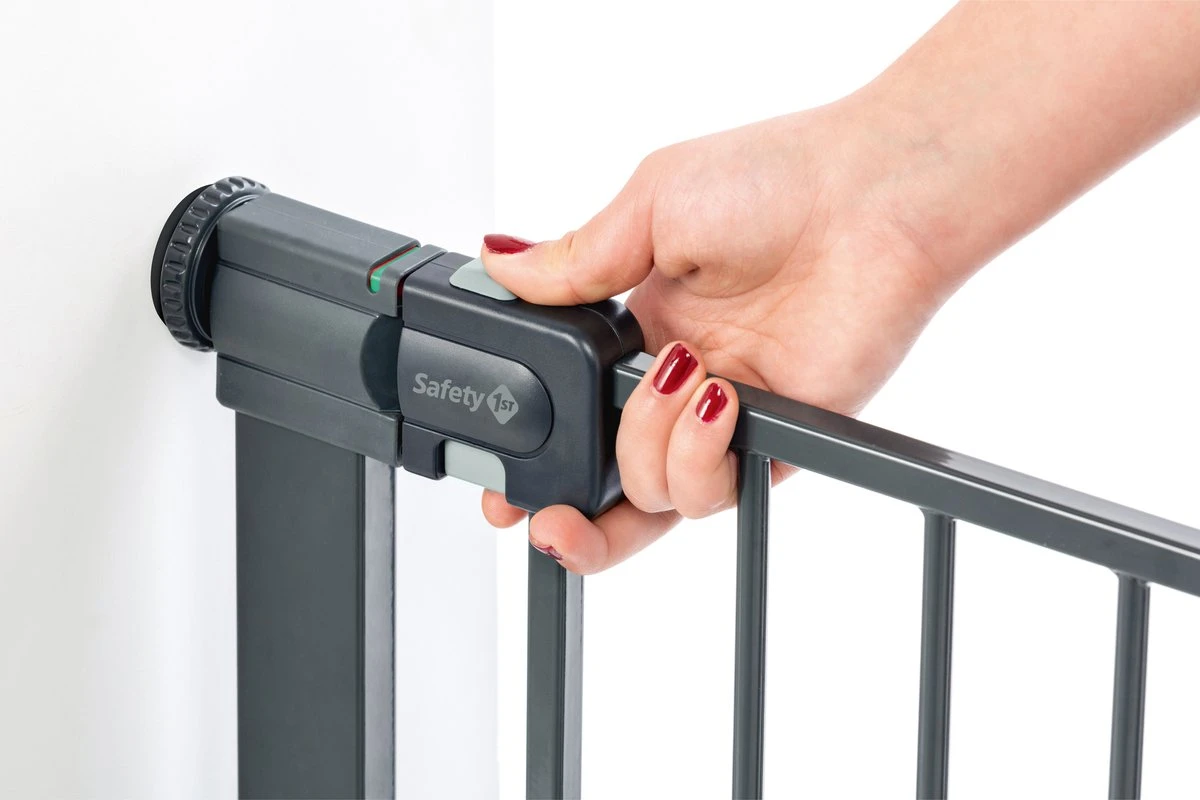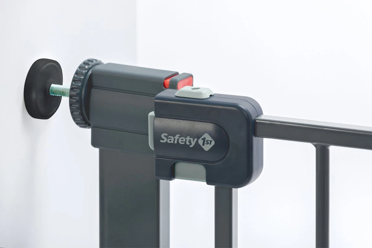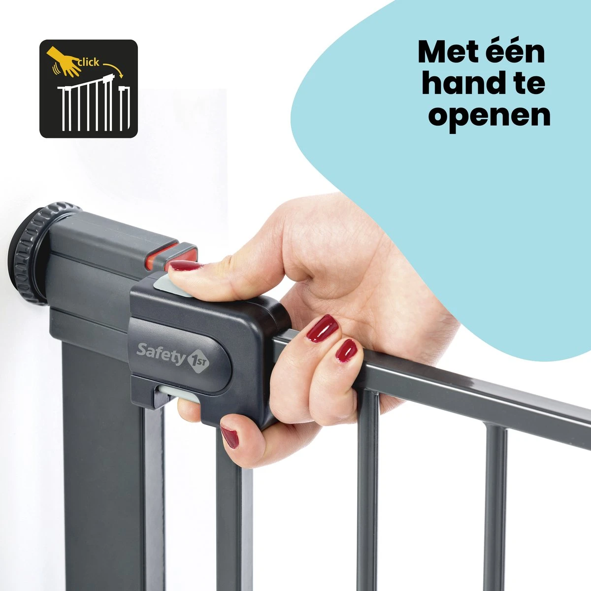 Het Safety 1st Easy Close Metal veiligheidshek met SecureTech® combineert eenvoud en veiligheid in een U-vormig drukhek. SecureTech®-indicator in het nieuwe handgreepontwerp zorgt ervoor dat de poort veilig wordt geïnstalleerd en goed wordt gesloten. Een slimme functie vergemakkelijkt ook de installatie en het moeiteloos opnieuw vastmaken van het babyhekje. Dit brede babyhekje is handig in gebruik, terwijl een dubbel vergrendelingsmechanisme bijdraagt aan de veiligheid. Dit traphekje is geschikt voor openingen tussen 73cm en 80cm maar kan met apart verkrijgbare verlengstukken verlengd worden tot 136cm.