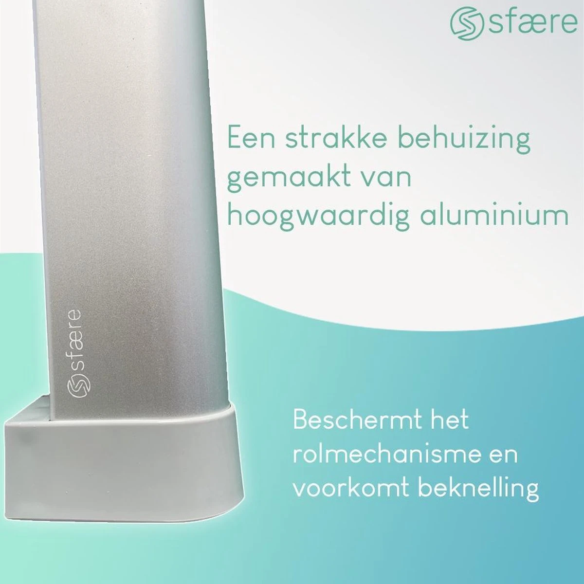 Het strakke design van de behuizing waar het hekwerk zichzelf in oprolt is gemaakt van excellent aluminium. Anders dan bij traphekjes zonder behuizing, zorgt het aluminium voor de bescherming van het rolmechanisme en voorkomt het beknelling bij het oprollen. Verder is het hekwerk gemaakt van een stevige en duurzame ‘mesh fabric’. Deze heeft een aangebrachte PVC coating die beschermt tegen scheuren en vlekken. Het doek dat uitrolbaar is tot 130cm en een hoogte heeft van 84cm maakt het mogelijk deze tussen elke deur of trapopening te gebruiken.