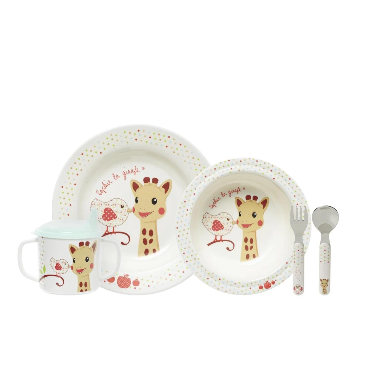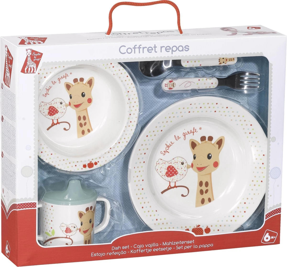 Sophie de giraf eetsetje in een geschenkkoffer. Sophie met Kiwi in rood, de beste vriend van de allerkleinsten. Een complete set om te leren eten als een volwassene! Terwijl uw kind eet, ontdekt hij het leuke Sophie de giraf decor.