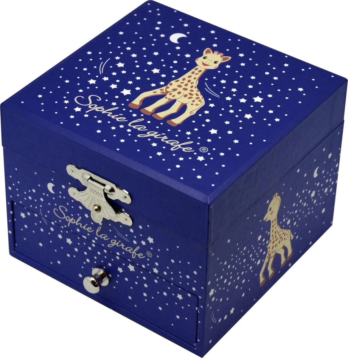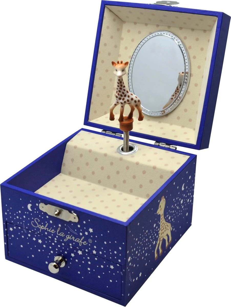 Dit schattige muziekdoosje van Sophie de giraf is perfect om kleine spulletjes van uw kindje in op te bergen. Wind het sleuteltje aan de achterkant op en zodra je het doosje opent zal het poppetje van Sophie de giraf gaan dansen op de muziek. In het laatje kunnen de kleinste schatten bewaard worden. De binnenruimte van de doos is bekleed met zacht vilt en bevat een kleine ovale spiegel aan de binnenkant van de deksel. De buitenkant bevat glow in the dark waardoor deze zal oplichten in het donker!