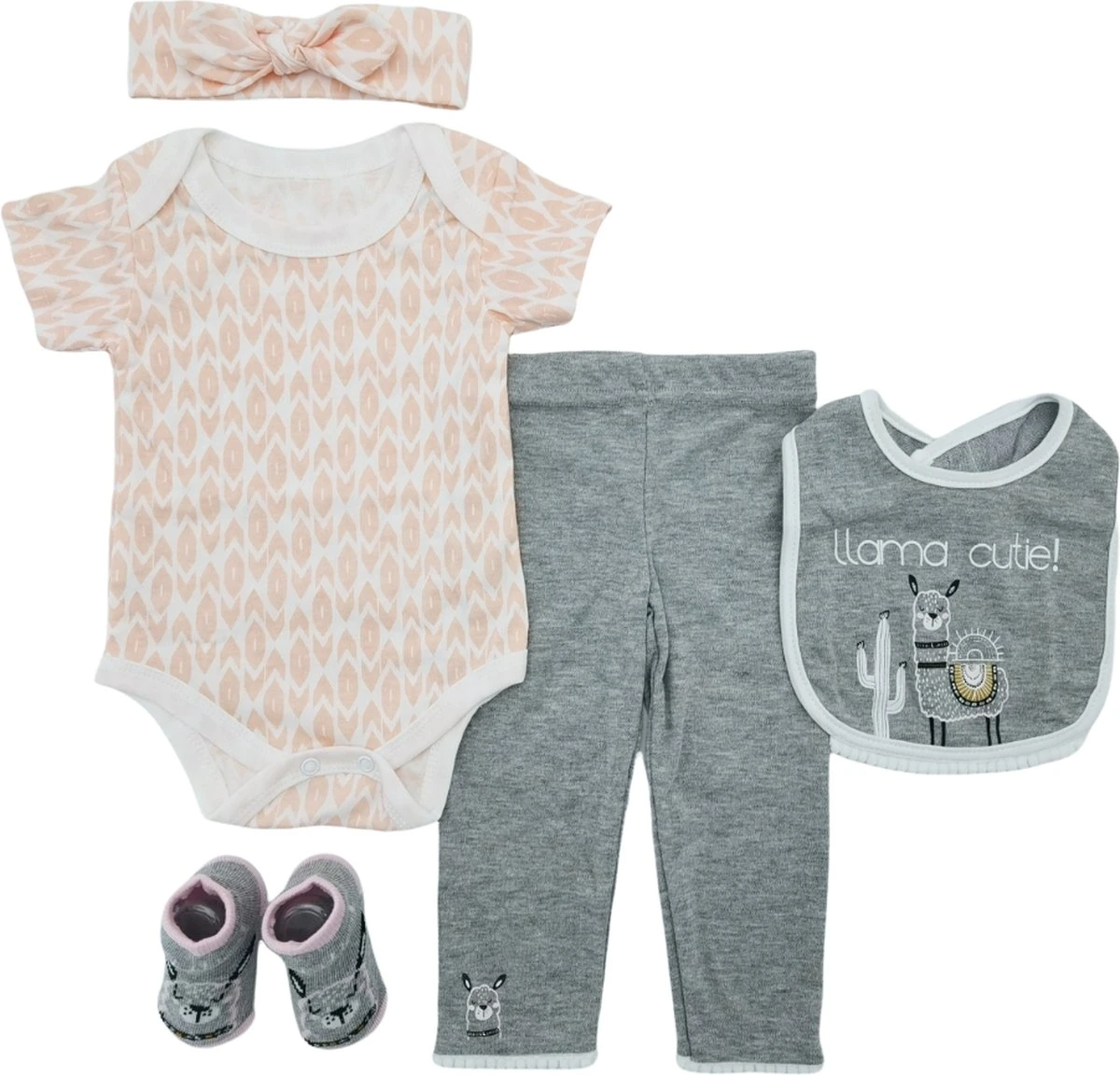 Deze set heeft maar liefst 5 kleertjes waaronder een rompertje, broekje, slabbetje, haarband en twee schattig sokjes.