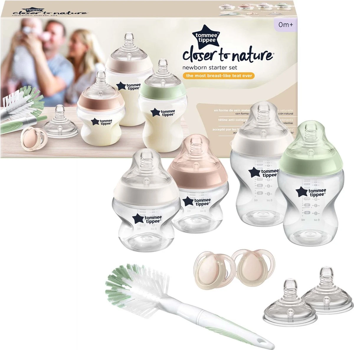 - Starterpakket voor pasgeboren baby’s: dit pakket bevat 2x 150 ml en 2x 260 ml Closer to Nature zuigflessen met spenen met langzame uitstroomsnelheid, 2 nachtspenen voor 0-6 maanden, 2x spenen met gemiddelde uitstroomsnelheid en een flessenborstel