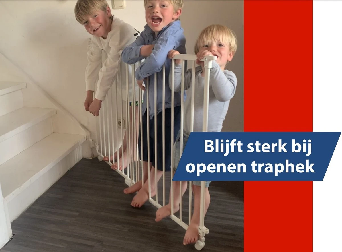 SafetyThings Traphekje 2 panelen op wielen beveilig je, jouw woning voor je kindje of huisdier, zoals een hond. Het traphekje is geschikt voor trapopeningen en deuropeningen van 84 tot 130 cm. Het traphekje is eenvoudig met één hand te bedienen. Dat is handig, want zo kun je het traphekje eenvoudig openen terwijl je je kindje op de arm hebt. Het traphekje voldoet aan de Europese veiligheidseisen en is 81 cm hoog. Het traphekje kan naar twee kanten toe geopend worden en kan eenvoudig verwijderd worden wanneer je hem niet gebruikt.