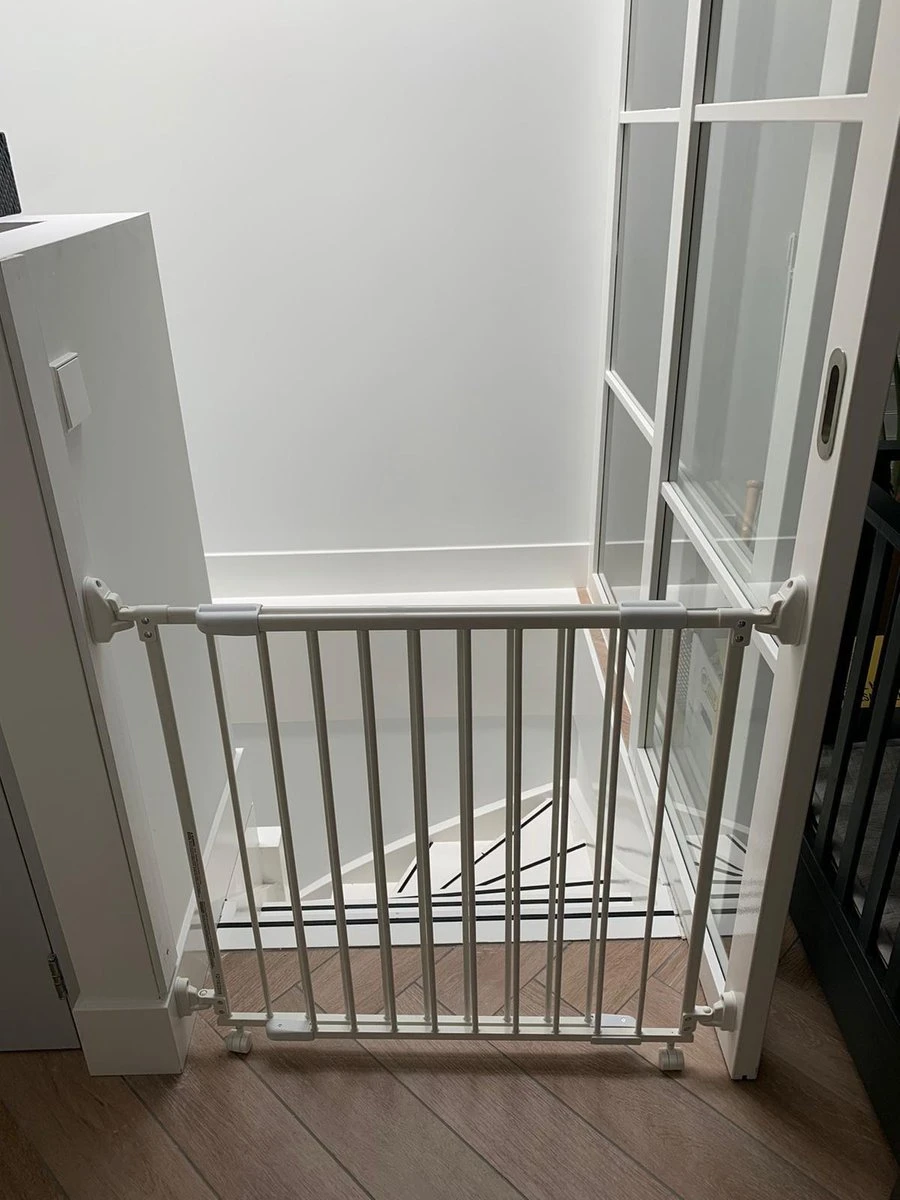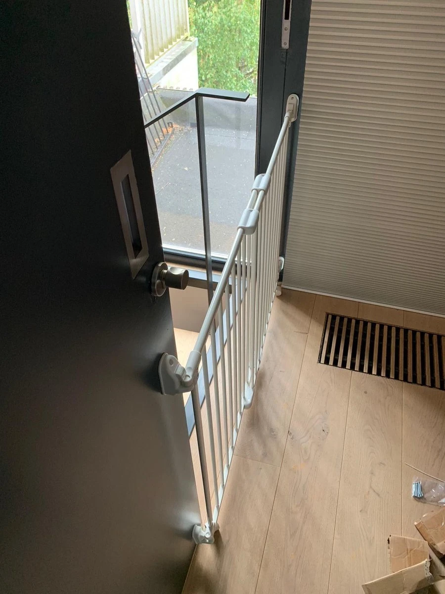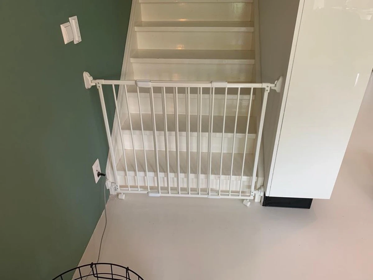 De meeste hekjes nemen een enorme ruimte op de overloop in beslag. Dit hekje kan door het schuifsysteem een stuk kleiner worden. De twee helften kunnen over elkaar heen schuiven.