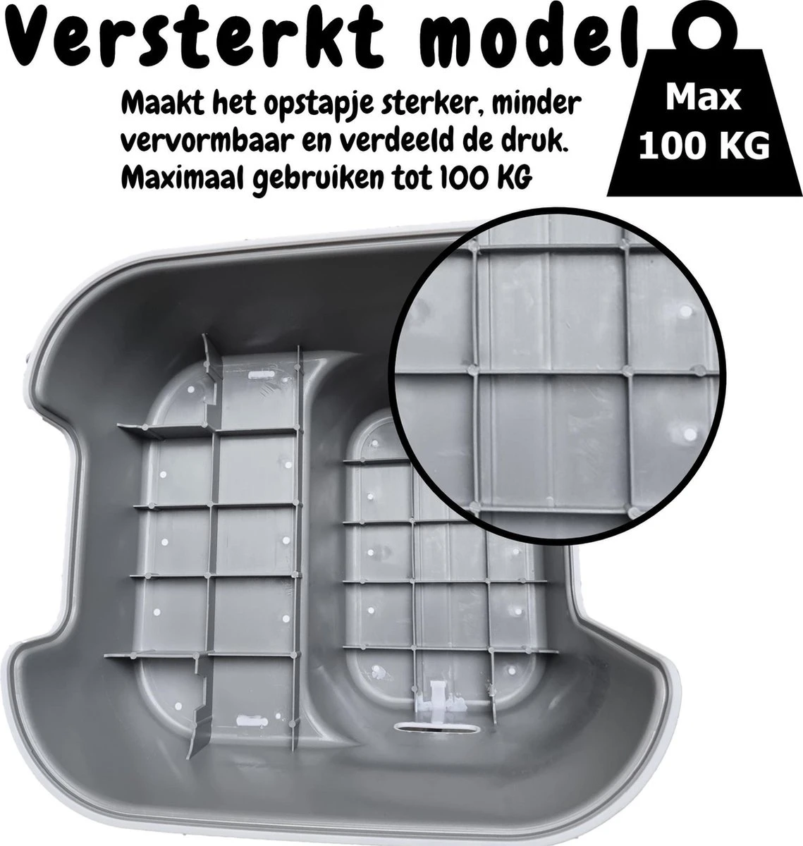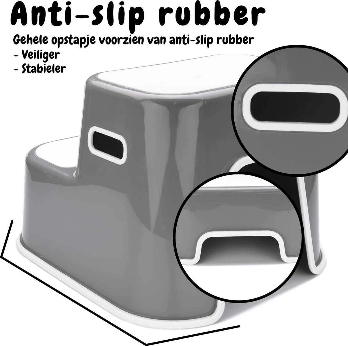 De handvaten van het opstapje beschikken eveneens over een antislip laag, hierdoor is hij gemakkelijker te tillen, ook indien je bijvoorbeeld natte handen hebt. Eveneens zijn beide treden voorzien van een rubberen antislip laag hierdoor is het opstapje veiliger in gebruik en verkoopt het uitglijden.