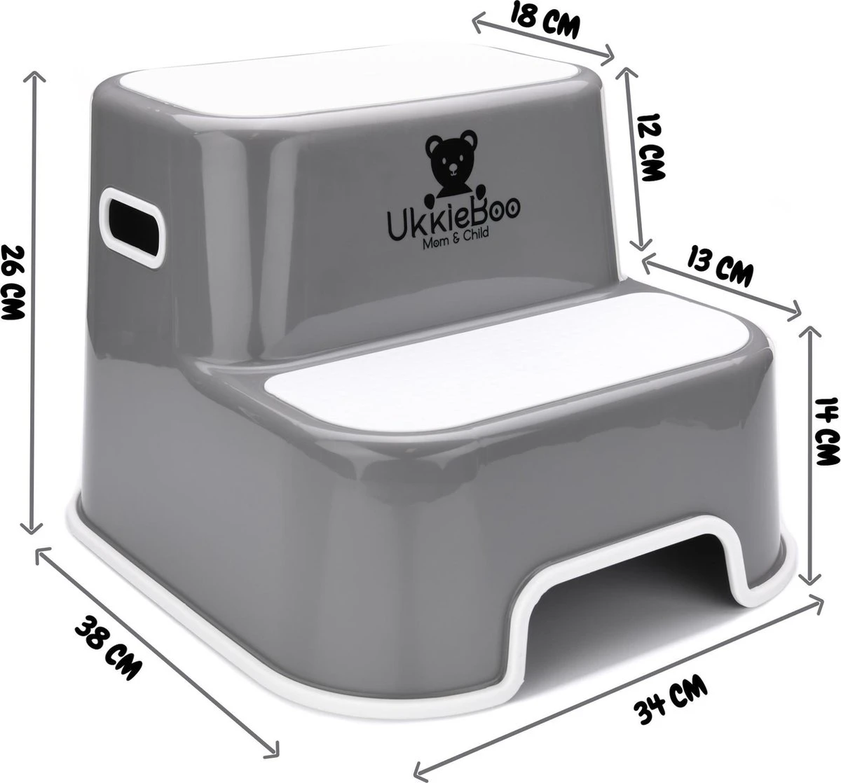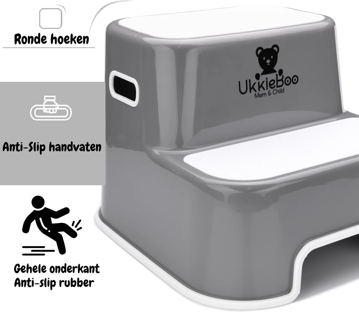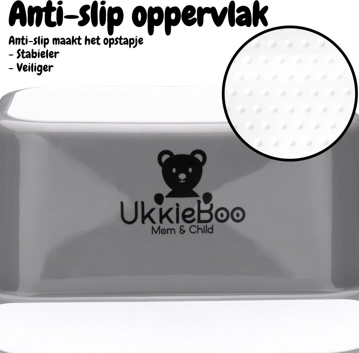 Het opstapje van UkkieBoo is zodanig ontworpen dat deze niet verschuift. De gehele onderkant is voorzien van een antislip laag, zodat jij en je kindje altijd veilig gebruik kunnen maken van het opstapje.