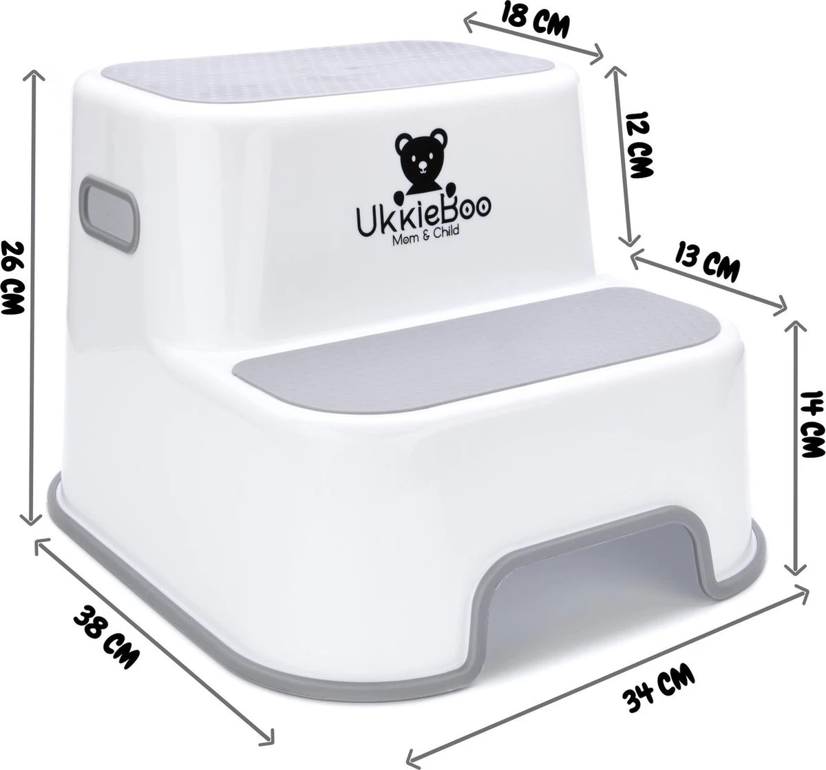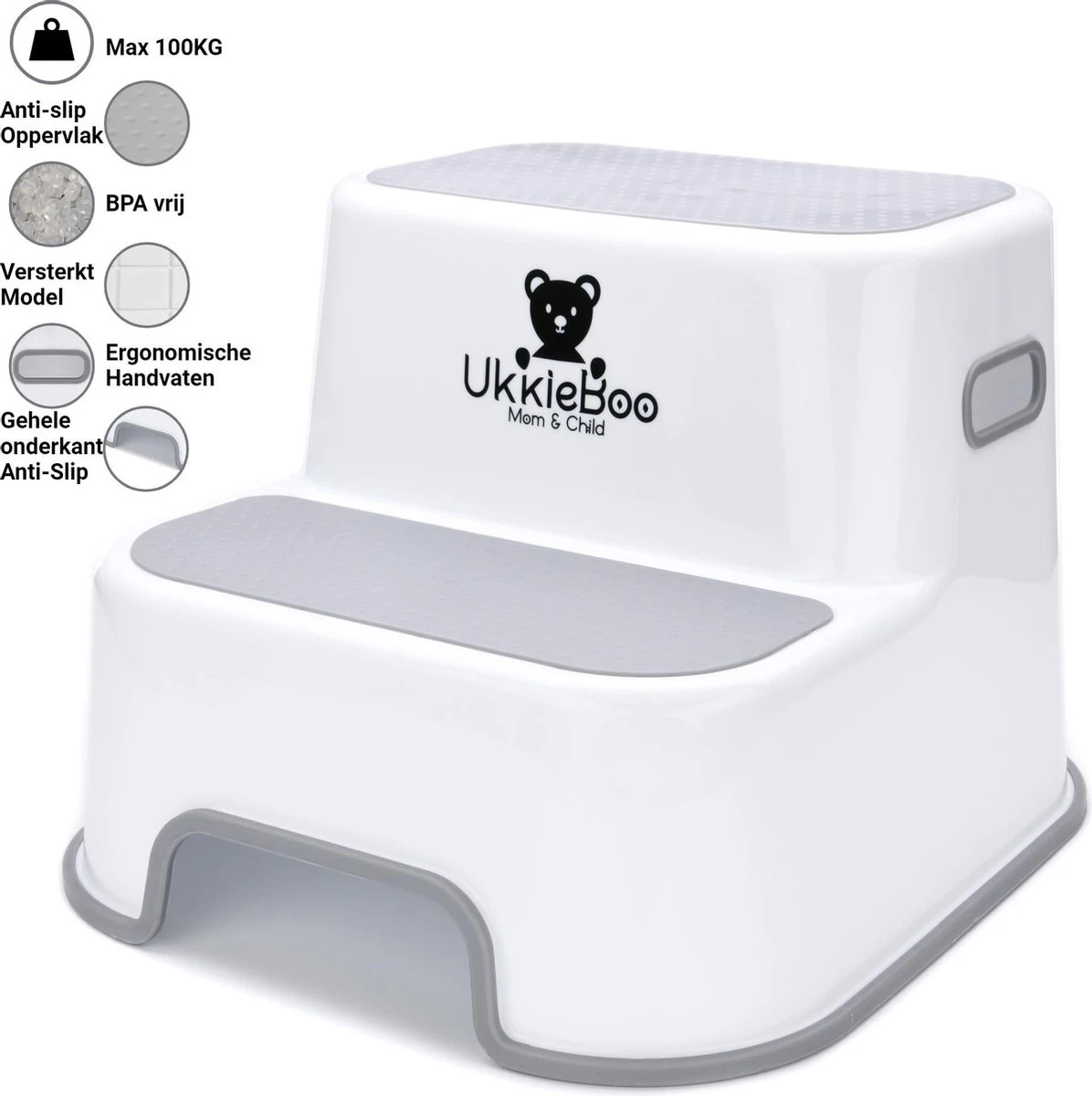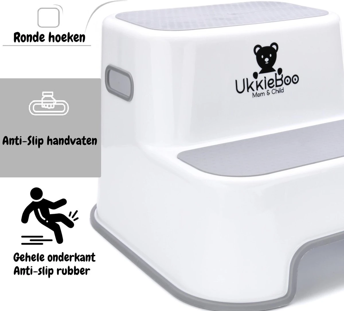 Het opstapje van UkkieBoo is zodanig ontworpen dat deze niet verschuift. De gehele onderkant is voorzien van een antislip laag, zodat jij en je kindje altijd veilig gebruik kunnen maken van het opstapje.