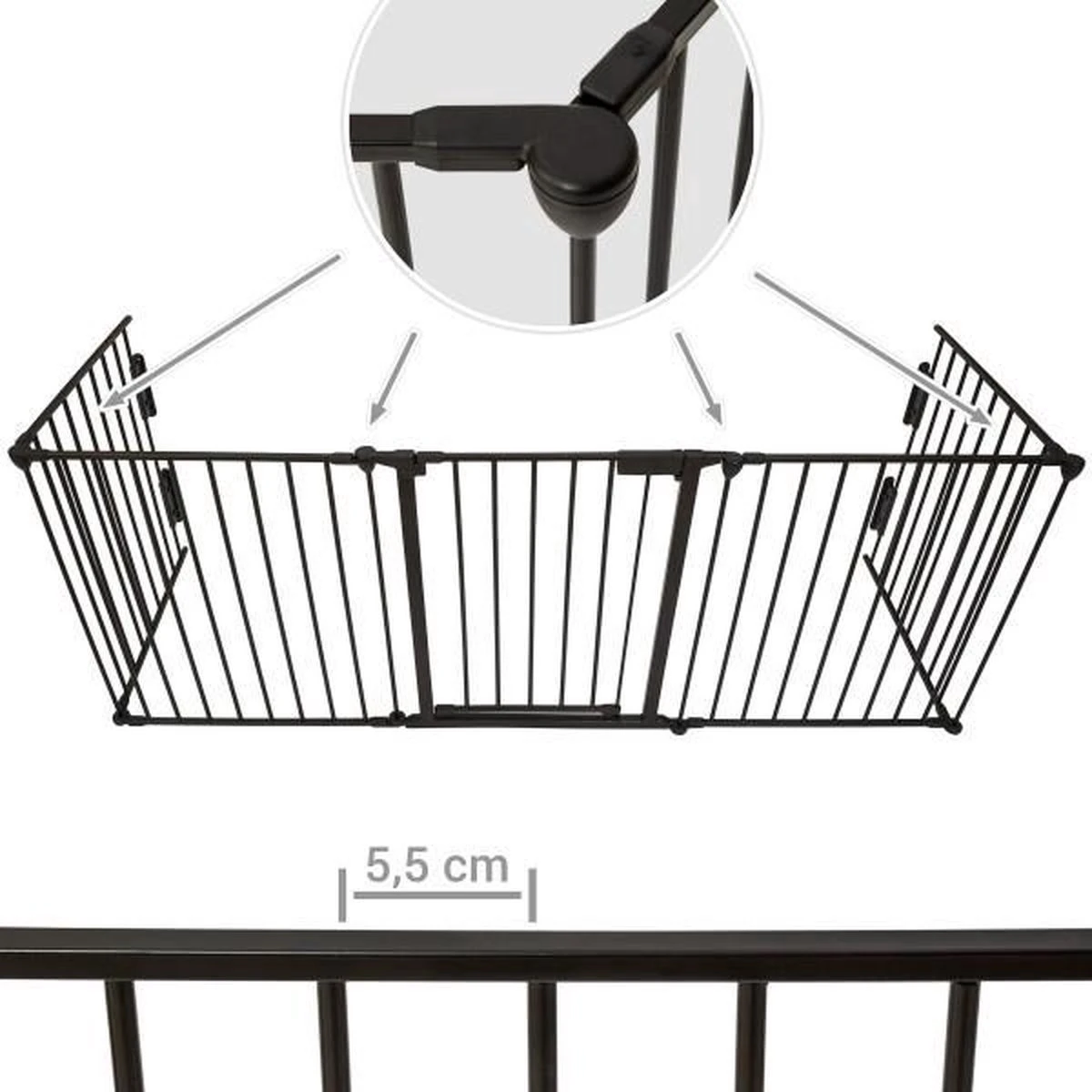 Het hek is ongeveer 300 cm lang en bestaat uit 5 delen, inclusief een deur element met een kindveilige sluiting. De deur kan naar beide kanten worden geopend.