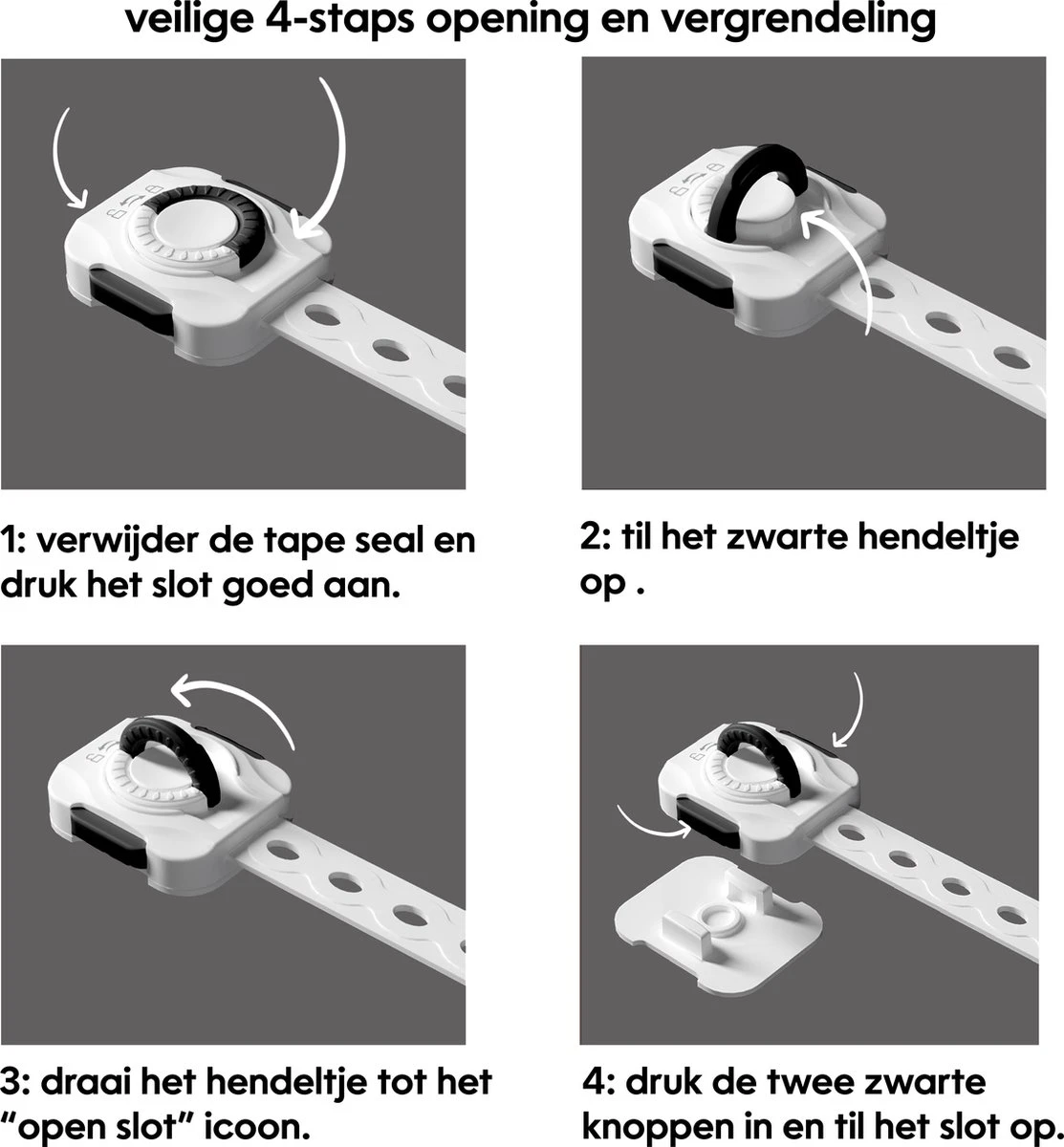 Je kunt de kindersloten op lades, kasten en zelfs deuren bevestigen. Het flexibele en 360º buigzame ontwerp maakt het eenvoudig te bevestigen, zelfs wanneer je geen klusser bent.