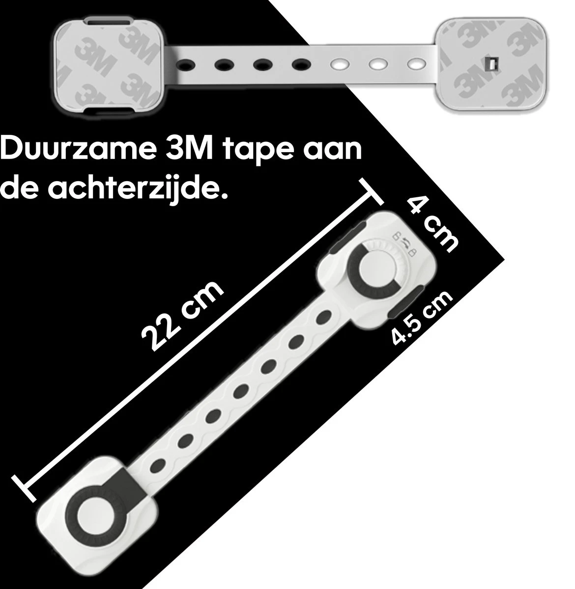 Dankzij de extra veilige 3 staps-beveiliging ben jij er zeker van dat jouw kleintje niet bij gevaarlijke artikelen in de buurt kan komen. De kindersloten zijn voorzien van een krachtige 3M lijmlaag waardoor het geen lijmresten achterlaat wanneer je het verwijdert. De lijmlaag kan tot wel 25kg gewicht aan. Je kunt er dus aan hangen zonder dat het loslaat.