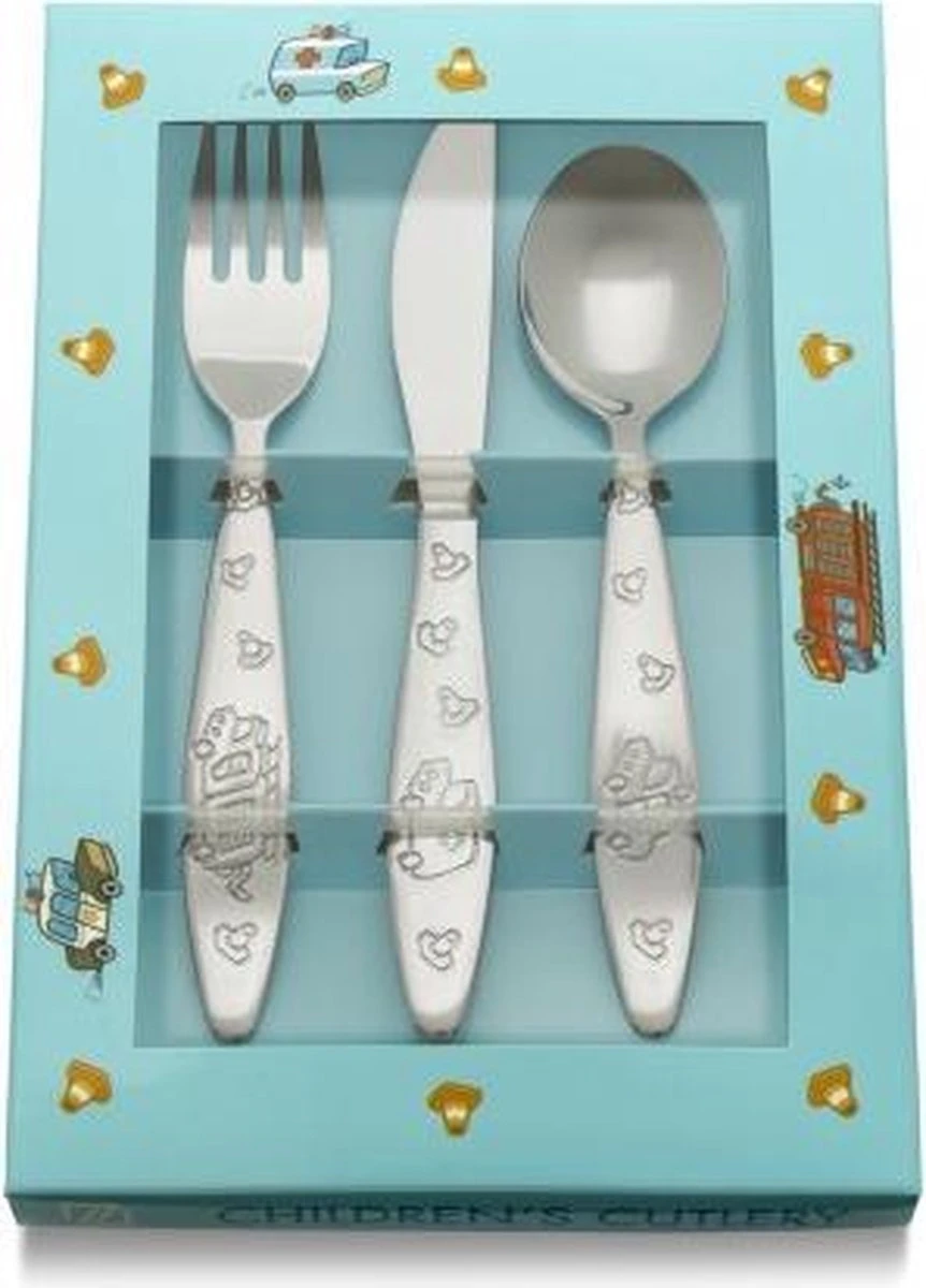 Tatu Tatu, daar komen de hapjes aan! Dit leuke 3-delige kindercouvert heeft de afbeeldingen van hulpdiensten gegraveerd. Het is gemaakt van 18/10 RVS en mag in de vaatwasser. Het setje wordt geleverd in een kleurrijke geschenkverpakking.