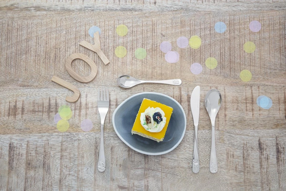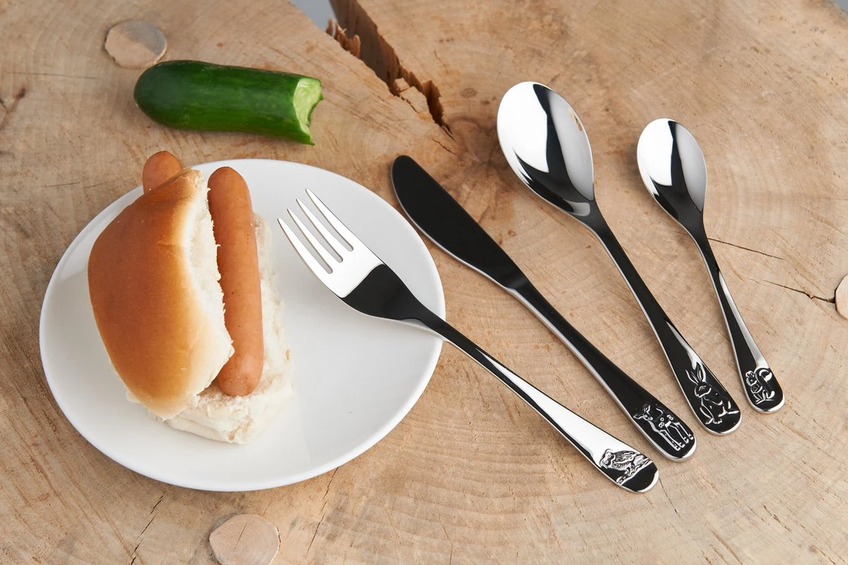 De bestekset bestaat uit een vork, lepel, mes en dessertlepel en wordt geleverd in een bijpassende geschenkverpakking.