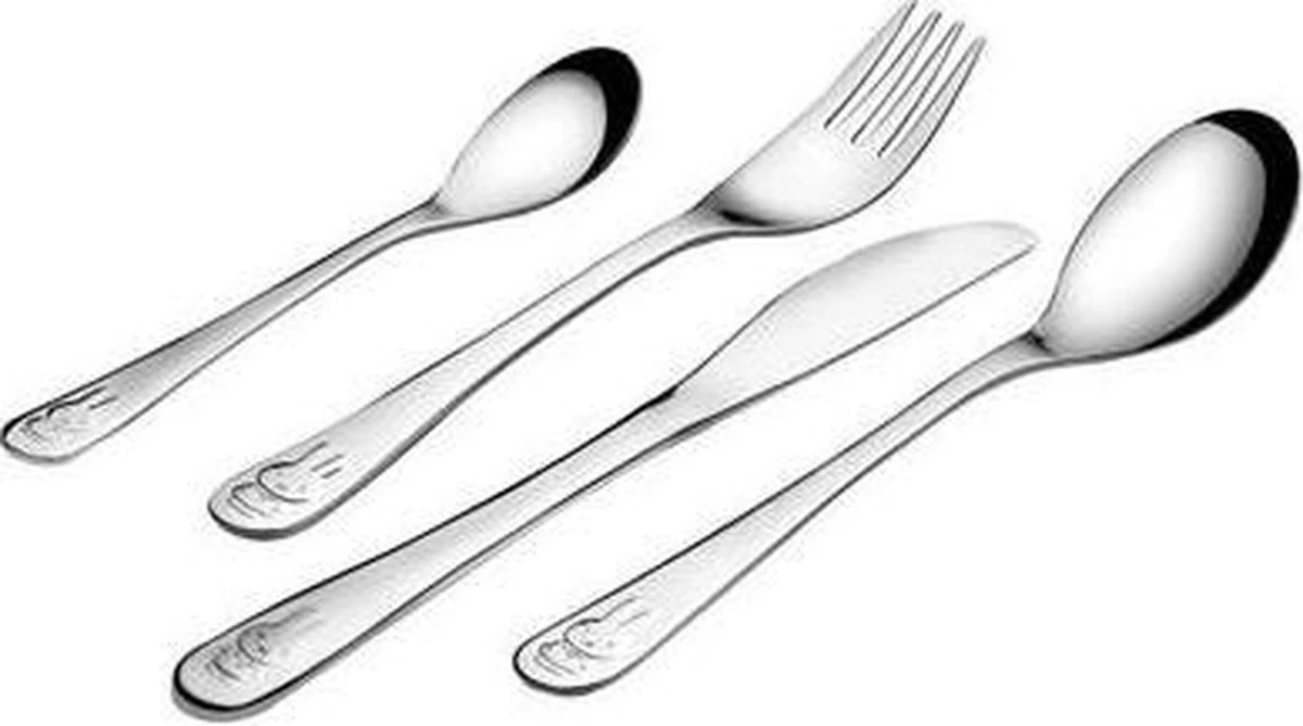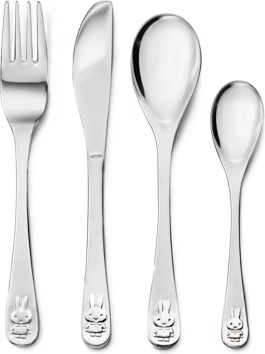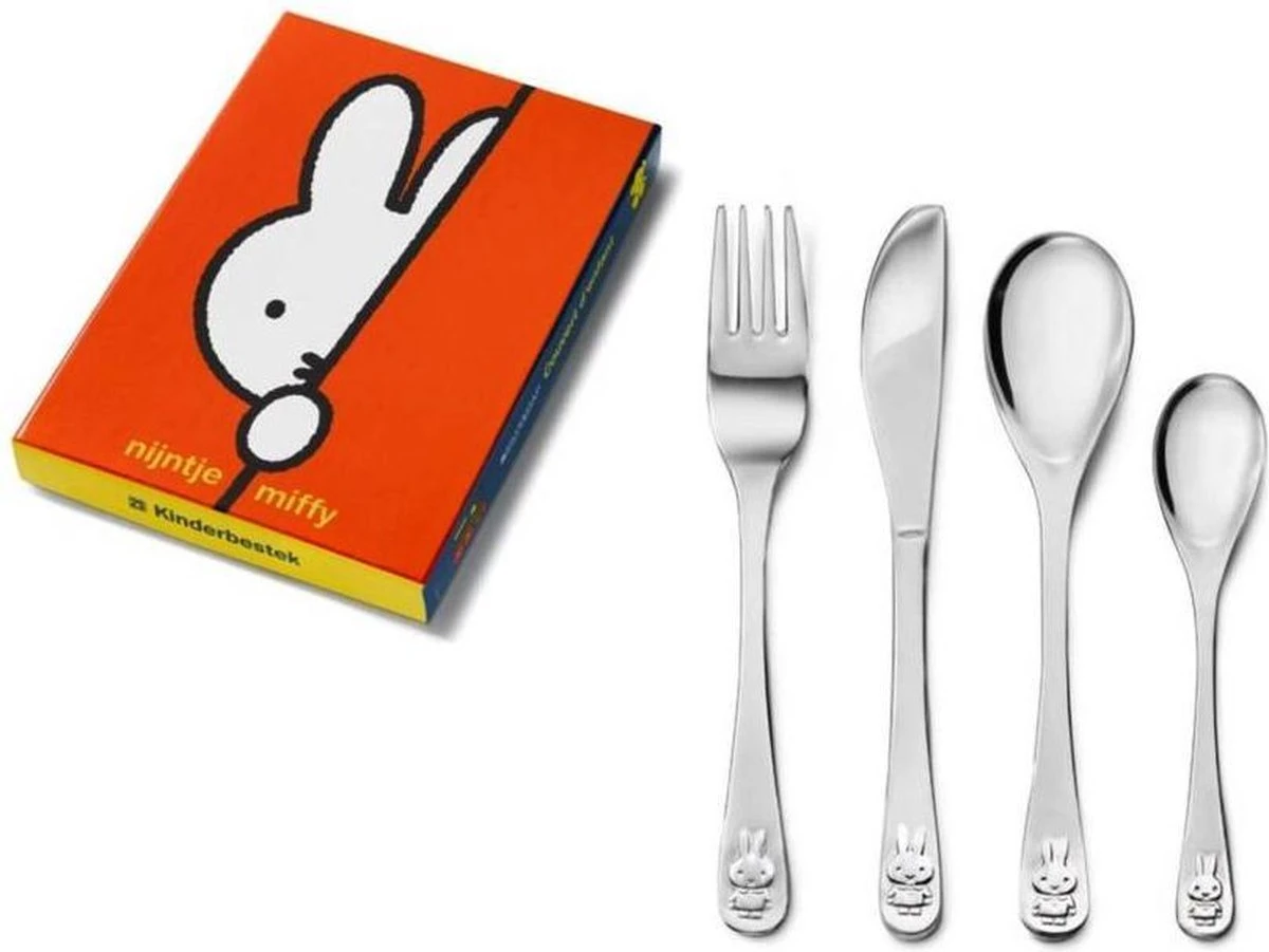 Populaire 4-delige bestekset van het wereldberoemde konijntje nijntje, getekend door Dick Bruna. Op ieder bestekonderdeel staat de afbeelding van nijntje. Omdat het bestek is vervaardigd uit 18/10 RVS kan het in de vaatwasser. De bestekonderdelen zijn geschikt om gegraveerd te worden. (let op: ga hiervoor naar een lokale graveerspecialist/juwelier) Wordt geleverd in een bijpassende geschenkverpakking.