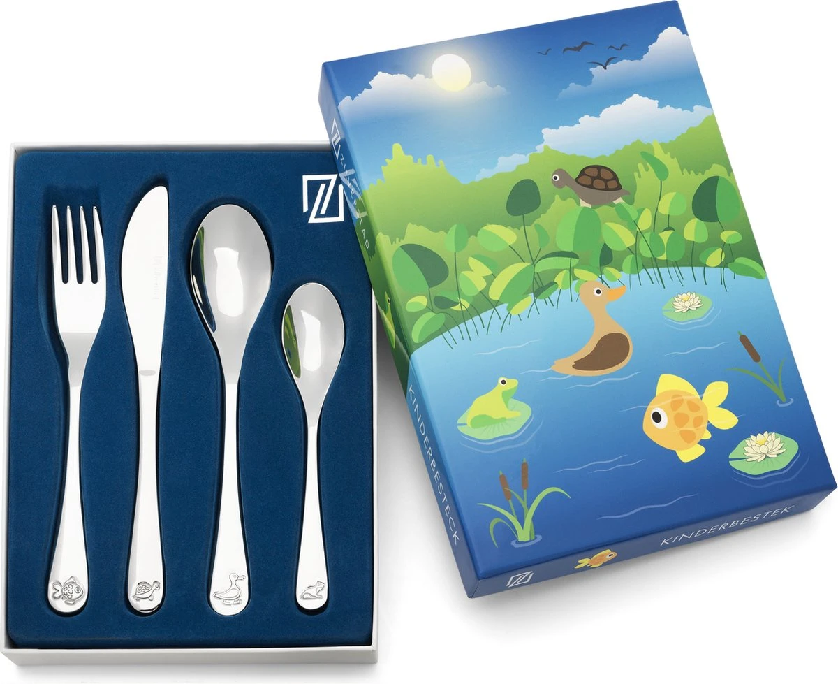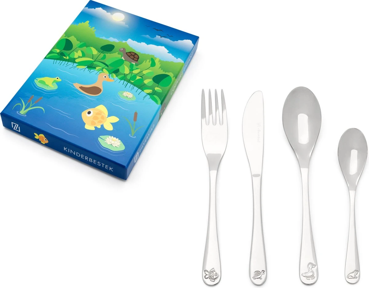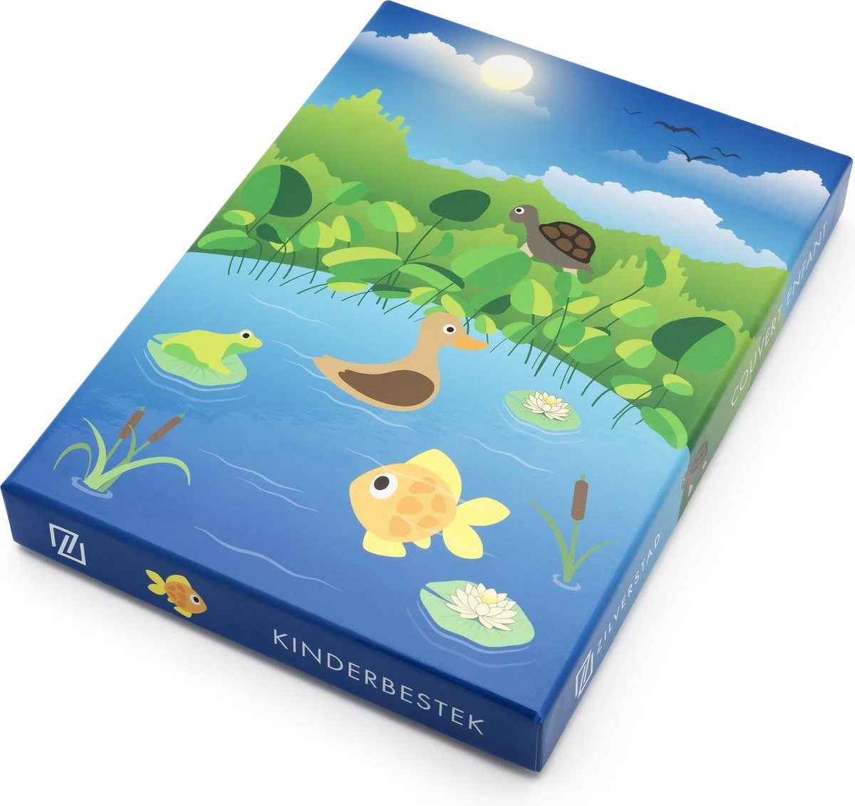 Op zoek naar een (kraam)cadeau? Van dit leuke besteksetje met vijverdieren wordt iedereen blij. Het thema is Dieren uit de vijver en op het bestek zijn een vis, schildpadje, eendje en een kikker gegraveerd. Het besteksetje is gemaakt van RVS 18/10. Poetsen is niet nodig en het besteksetje mag in de vaatwasmachine.