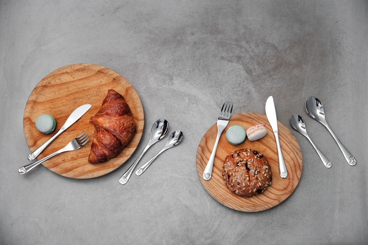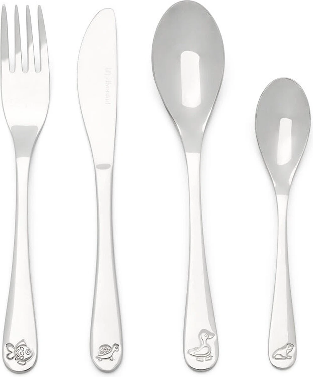 De bestekset bestaat uit een vork, lepel, mes en dessertlepel en wordt geleverd in een bijpassende geschenkverpakking.