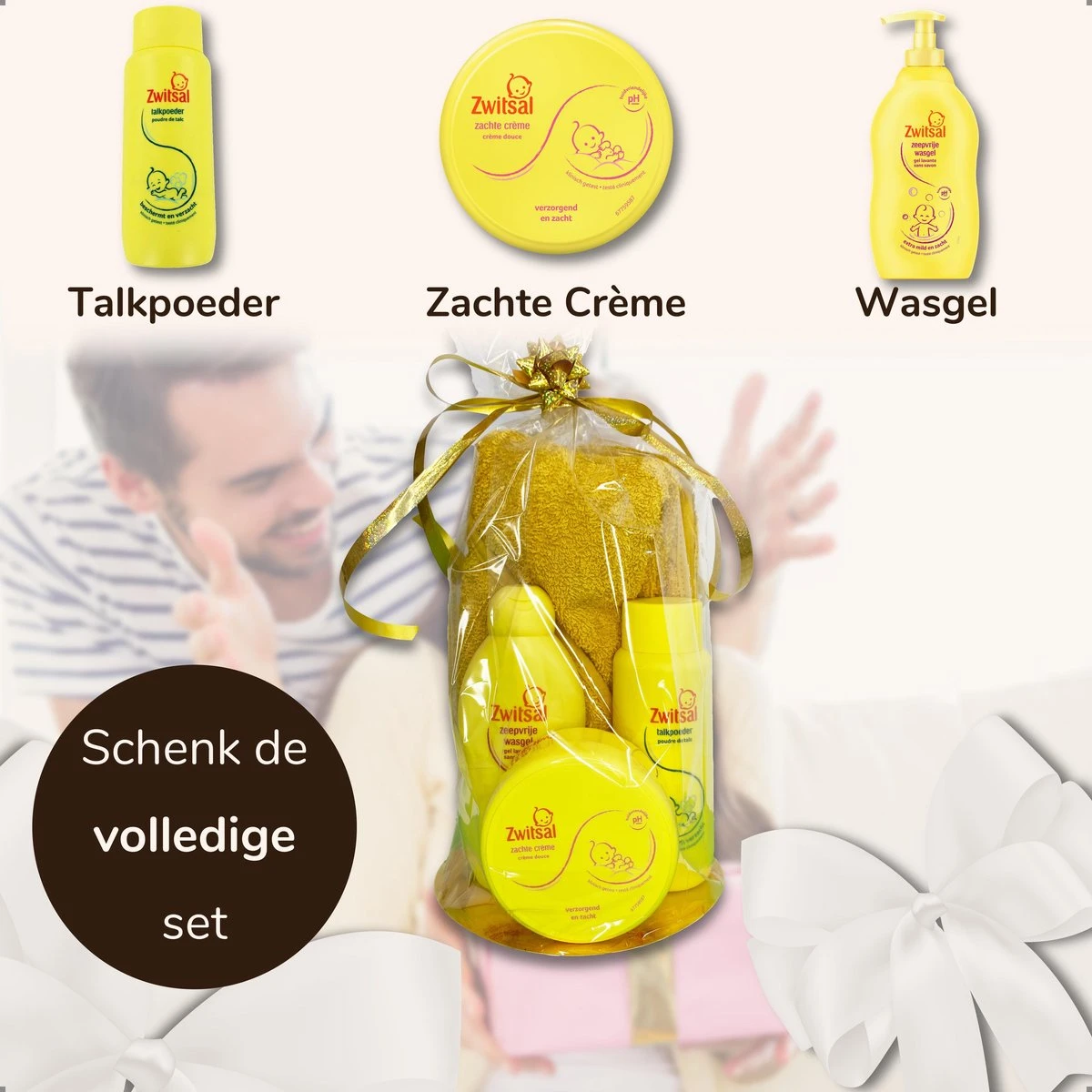 Na 9 lange maanden is het eindelijk zo ver! Een nieuw wonder op deze wereld en daar wil je de ouders uiteraard zo snel mogelijk voor feliciteren. Geef ze meteen een duwtje in de rug en verras hen met dit leuke pakket van baby shampoo, beschermde talkpoeder en zachte huidcrème, allemaal van het merk Zwitsal. Met dit geschenk krijgen de nieuwe mama en papa meteen de hele set cadeau. Bovendien krijg je er van Cadeau Compleet ook nog een super schattige badcape bij waarin de baby zich op en top fris zal kunnen voelen. Een blije baby is twee blije ouders!